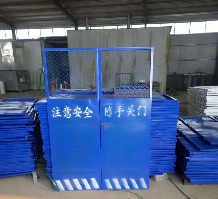 施工電梯防護(hù)門以焊接網(wǎng)片、擋板、方管為主要結(jié)構(gòu),網(wǎng)片網(wǎng)孔一般為50mm左右,絲徑一般在3.0mm以上,安全門方管尺寸一般為20*30mm或30*30mm尺寸,安全防護(hù)門擋板寬度、厚度按客戶要求定制;